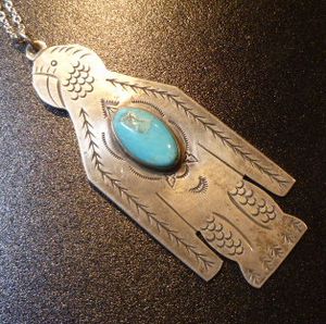 アンティークならではのオーラが魅力あふれる、ターコイズ付きサンダーバード型ペンダントネックレスになります。
