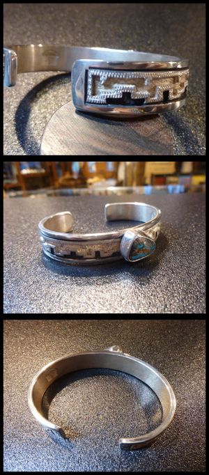 見事なラグ柄オーバレイがデザインされた、ナバホ族のバングルになります。