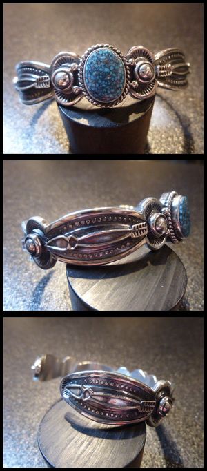 トラディショナルなスタンプワークにターコイズをセットした、ナバホ族のバングルになります。