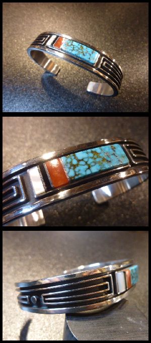 インレイはキングマンターコイズ、マザーオブパール、コーラル、Black Jade(大理石)と