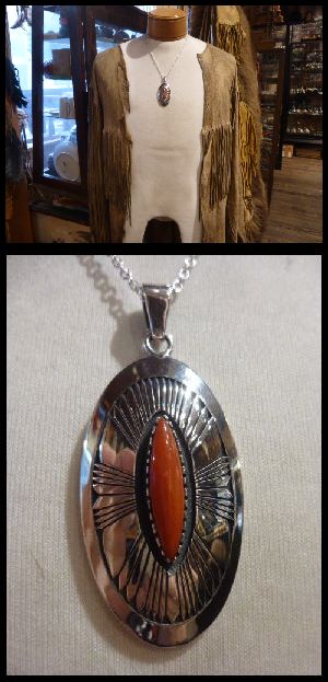 高級感溢れるメディタレニアンコーラルをセットした、ナバホ族のペンダントトップになります。