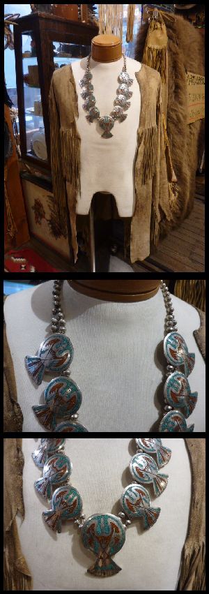 ナバホ族のスカッシュブロッサムスタイルのペヨーテバードネックレスになります。
