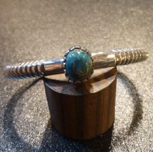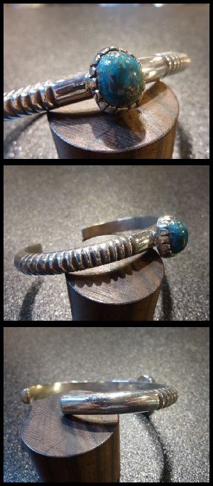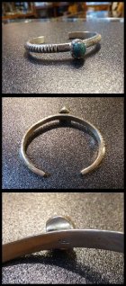 シンプルな仕上がりにビスビーターコイズがセットされた、ナバホ族のバングルになります。