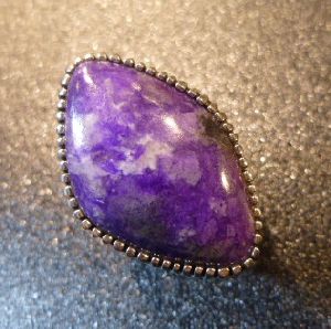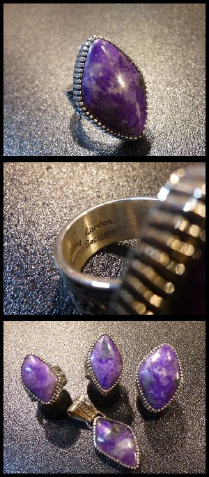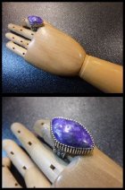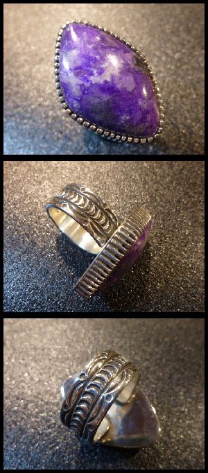 シンプルなスタンプワークにスギライトがセットされた、ナバホ族のリングになります。