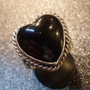 代名詞であるスタンプワークにハート型のブラックオニキスをセットした、ナバホ族のリングになります。