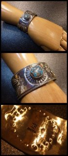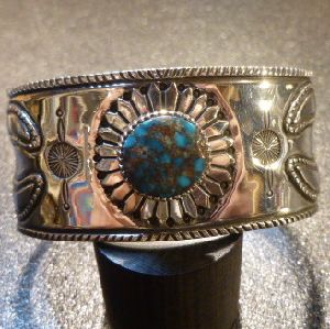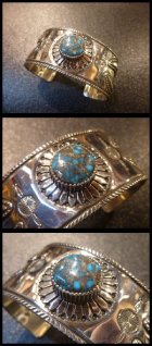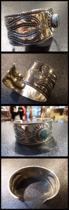 見事なスタンプワーク&ターコイズで完成された、ナバホ族のバングルになります。