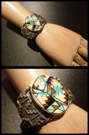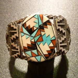見事なストーンインレイ&トゥーファーオーバレイがものすごく美しい、ナバホ族のバングルになります。