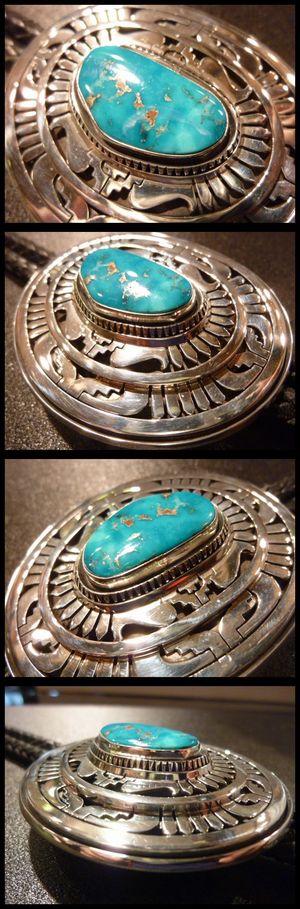 ハイグレードのモレンチターコイズの付いた、ナバホ族のボロタイになります。
