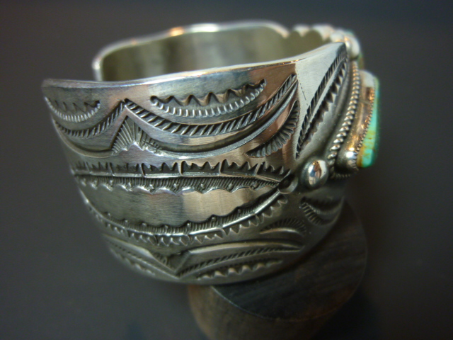 整ったスタンプワークにものすごくきれいなロイストーンターコイズが3つセットされた、
