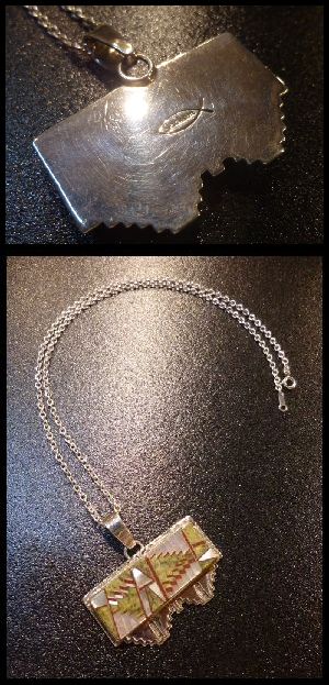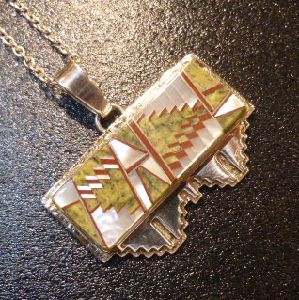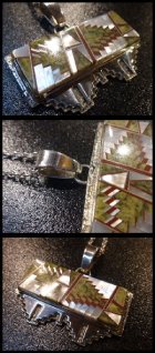 以可学模様のストーンインレイがものすごく美しい、ナバホ族のペンダントトップになります。