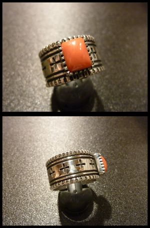 ものすごく綺麗なスタンプワークにレッドコーラルをセットした、ナバホ族のリングになります。