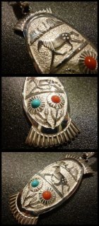 可愛らしいフラワーにホース&マウンテンをデザインした、ナバホ族のペンダントトップになります。
