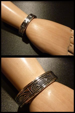 ワイルドかつ上品な仕上がりのオーバレイが美しい、ナバホ族のバングルになります。