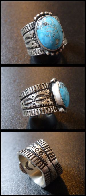 狂いのないスタンプワークにキングマンターコイズをセットした、ナバホ族のリングになります。
