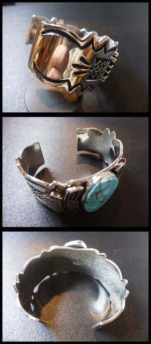 ワイルドかつ上品な仕上がりのオーバレイが美しい、ナバホ族のバングルになります。