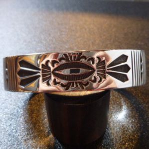 シンプルな中にも圧倒的な存在感溢れるスタンプワークが施された、ナバホ族のバングルになります。