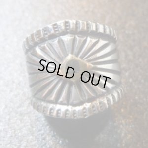 存在感あふれるサンバーストをモチーフにした、ナバホ族のリングになります。