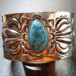 ナバホ Ray・Adakai ダブルスタンプワーク モレンチターコイズ付 約3・8cm幅バングル約16〜16・5cm用