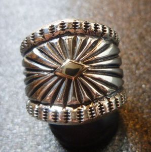 存在感あふれるサンバーストをモチーフにした、ナバホ族のリングになります。