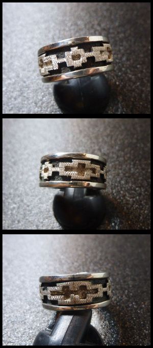 見事なラグ柄オーバレイがデザインされた、ナバホ族のリングになります。