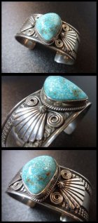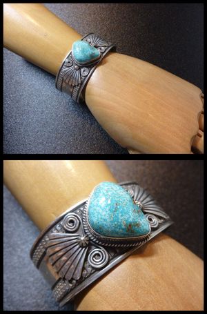 定評あるスタンプワークにターコイズをセットした、ナバホ族のバングルになります。