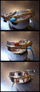 ナバホ シルバー&ゴールドライン ターコイズ&コーラル付 フェザーモチーフ バングル約15〜16・5cm用