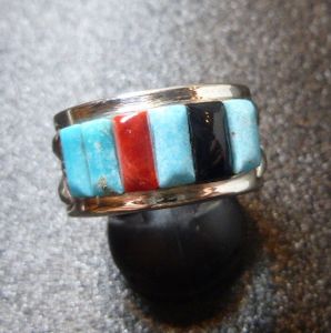 ナバホ Ray・Adakai マルチカラーストーンインレイ&スタンプワーク 1/2インチ幅リング21・5号