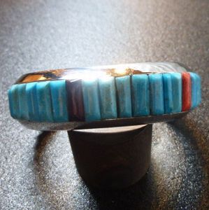 色カラフルなストーンインレイとスタンプワークで仕上がった、ナバホ族のバングルになります。