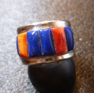色カラフルなストーンインレイとスタンプワークで仕上がった、ナバホ族のリングになります。