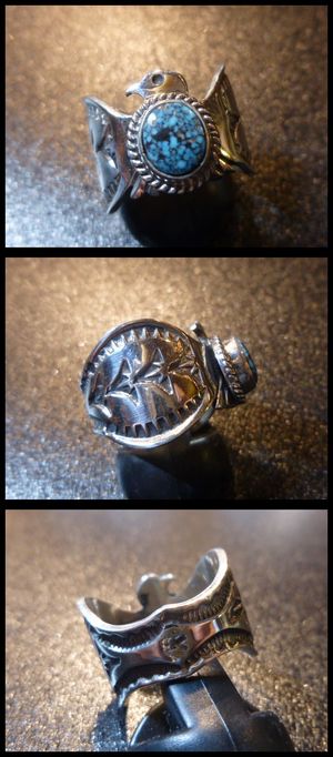ナバホ Sunshine・Reeves スタンプワーク キングマンターコイズ付 イーグル型リング18号