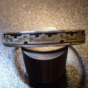 見事なラグ柄オーバレイがデザインされた、ナバホ族のバングルになります。