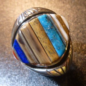 マルチカラーストーンでのインレイで完成された、ナバホ族のリングになります。