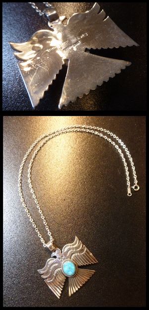 定番のスタンプワークにターコイズをセットした、ナバホ族のイーグル型ペンダントトップになります。