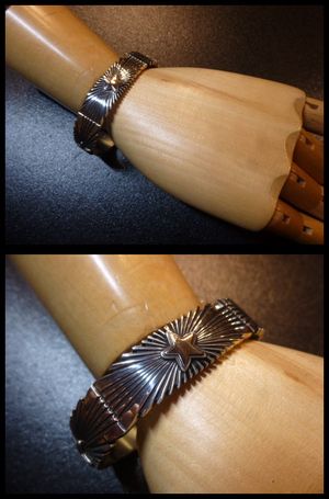 見事なサンバースト&14Kゴールドスターがものすごく美しい、ナバホ族のバングルになります。